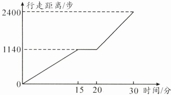 (1)由图象可知,从家到车站步行时间为$15$分钟,步行距离对应的步数为从$0$到$1140$步;$15 - 20$分钟为乘公交车时间,此过程步数未变;$20 - 30$分钟为下车后走路时间,步数从$1140$步增加到$2400$步。