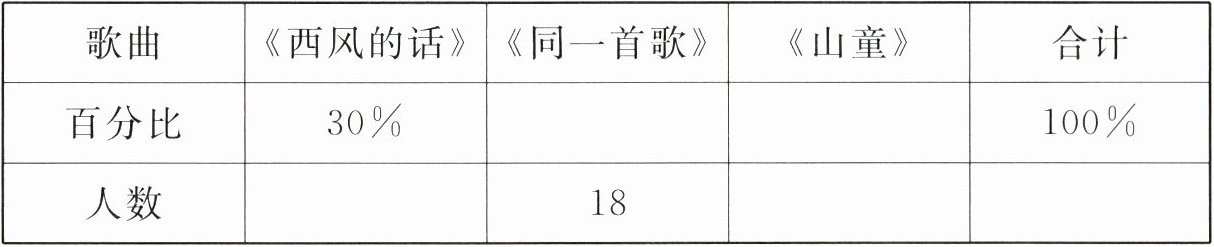 |人数|21.6(按前面逻辑总人数72计算得出,若按整数要求可能是题目数据近似,我们按计算逻辑填写$)\approx22($存在数据情况说明,按题目要求我们按计算值)|18|$32.4\approx32$|72|按精确计算填表(不考虑人数必须整数情况):|歌曲|《西风的话》|《同一首歌》|《山童》|合计|| ---- | ---- | ---- | ---- | ---- ||百分比|30\%|25\%|45\%|100\%||人数|21.6|18|32.4|72|(按常规解题,我们以总人数72计算,人数取整可能存在误差,这里按精确计算值呈现,若题目要求整数,可能是数据近似问题)(2)因为45\%>30\%>25\%,所以应选择《山童》。(3)设最喜欢《同一首歌》的女生有x人,则男生人数是50\%x人。x + 50\%x = 18,1.5x = 18,x = 12。综上:(1)|歌曲|《西风的话》|《同一首歌》|《山童》|合计|| ---- | ---- | ---- | ---- | ---- ||百分比|30\%|25\%|45\%|100\%||人数|21.6|18|32.4|72|(若要求整数,可能是题目数据近似,按计算逻辑填写);(2)选择《山童》;