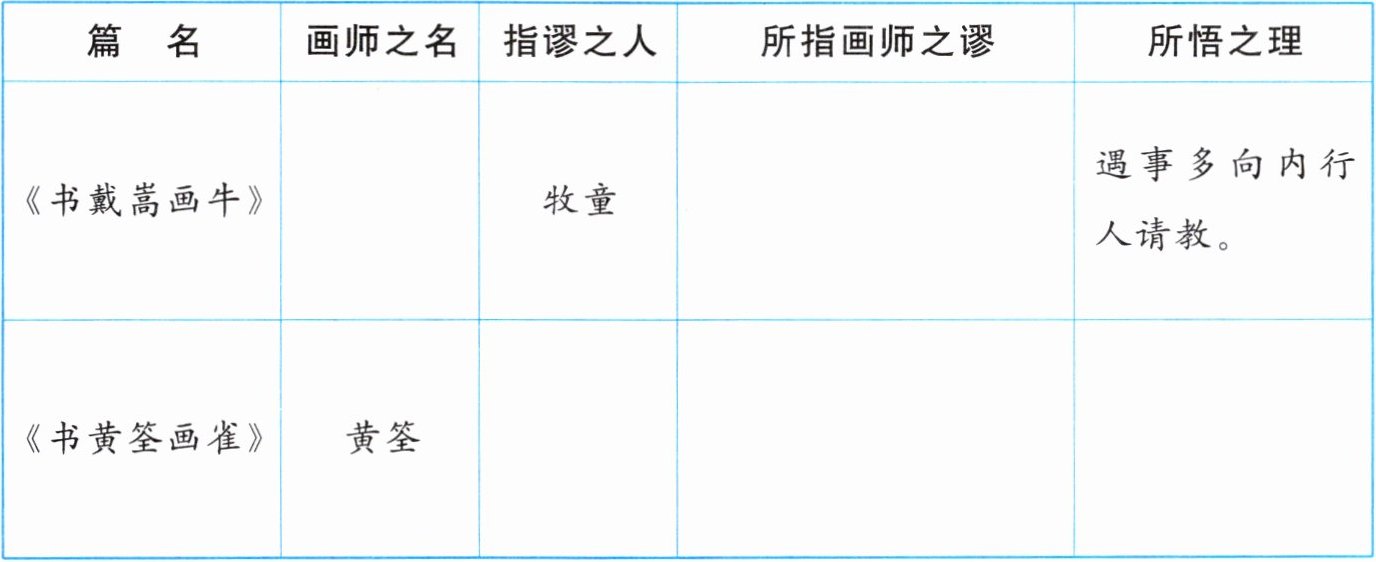 1.(1)书写,记录 (2)检验,验证 2.示例:由这件事我们知道,如果不能仔细地观察事物,就算只是个画师,也无法做好本职工作,更何况是做大事的人呢? 3.(1)√ (2)√ (3)× 4.戴嵩 斗牛之尾应搐入两股之间,而画中斗牛却摆尾而斗。 有人 飞鸟的颈和足都伸展是不符合生活实际的。 君子应该务学而好问。