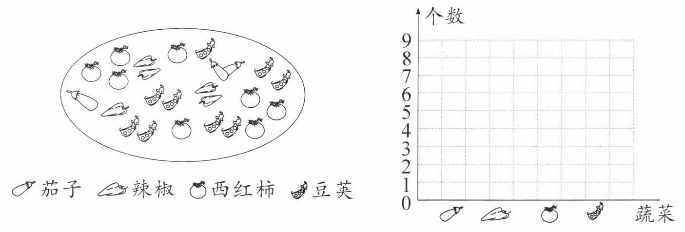 一、下面是一个蔬菜大拼篮,请完成条形统计图,并回答问题。