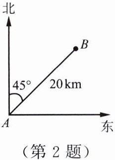 2. 如图所示,以灯塔 $ A $ 为观测点,小岛 $ B $ 在灯塔 $ A $ 的北偏东 $ 45^{\circ} $ 方向上,距灯塔 $ A $ $ 20 \, km $ 处。若以小岛 $ B $ 为观测点,则灯塔 $ A $ 在小岛 $ B $ 的方向上,距小岛 $ B $ $ km $ 处。