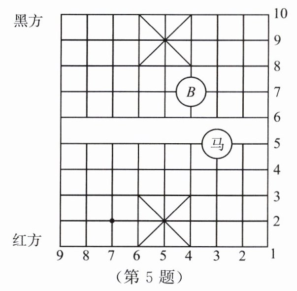 5. 如图所示,观察中国象棋的棋盘,其中红方“马”的位置可以用一个数对 $ (3,5) $ 来表示,红方“马”走完“马三进四”后到达点 $ B $,则表示点 $ B $ 位置的数对是。