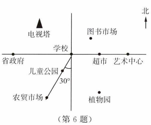 (2)离学校最近的设施:儿童公园;方向:南偏西30°;这个方向上还有农贸市场;区分方法:距离。