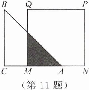 11. 如图所示,等腰直角三角形 $ ABC $ 的直角边长与正方形 $ MNPQ $ 的边长均为 $ 10 $,$ AC $ 与 $ MN $ 在同一条直线上,开始时点 $ A $ 与点 $ M $ 重合,让 $ \triangle ABC $ 向右运动,最后点 $ A $ 与点 $ N $ 重合。试写出重叠部分的面积 $ y $ 关于 $ MA $ 的长度 $ x $ 的关系式,并指出其中的常量与变量。