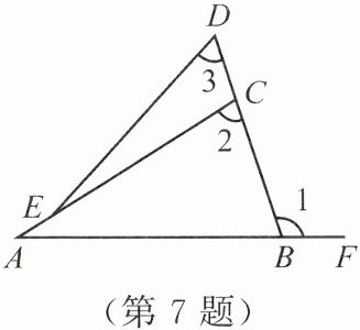 7. 如图所示,在$\triangle ABC$中,$E$为边$AC$上一点,延长$AB$到点$F$,延长$BC$到点$D$,连结$DE$.$\angle 1$,$\angle 2$,$\angle 3$的大小关系为().