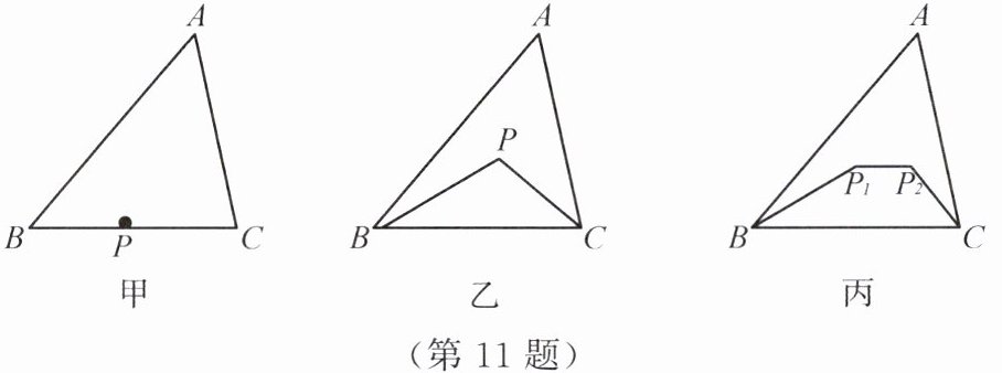 (3)将(2)中点 P 变为两个点 $P_1$,$P_2$,如图丙所示,试观察和比较四边形 $BP_1P_2C$ 的周长与△ABC 的周长的大小,并说明理由.