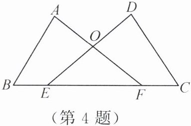 4. 如图所示,点$E$,$F$在$BC$上,$BE=CF$,$∠A=∠D$,$∠B=∠C$,$AF$与$DE$交于点$O$。