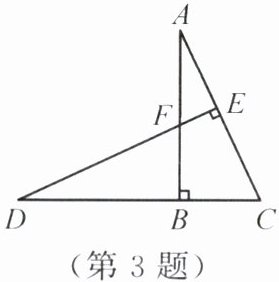 3. 如图所示,在$Rt\triangle ABC$中,$∠ABC=90^{\circ}$,$D$是$CB$的延长线上的点,$BD=BA$,$DE⊥AC$于点$E$,交$AB$于点$F$。若$DC=2.6$,$BF=1$,则$AF$的长为()。