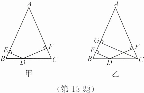 13. 如图甲所示,在△ABC 中,AB = AC,D 是 BC 边上任意一点,过点 D 分别向 AB,AC 引垂线,垂足分别为 E,F.
