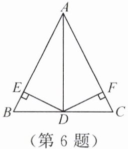 6. 如图所示,在△ABC中,AB=AC,AD平分∠BAC,DE⊥AB,DF⊥AC,E,F为垂足,有下列四个结论:①DE=DF;②BE=CF;③AD⊥BC且BD=CD;④∠BDE=∠CDF。其中正确的个数是()。