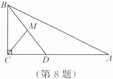 8. 如图所示,在$\triangle ABC$ 中,$\angle ACB = 90^{\circ}$,点 $D$ 在 $AC$ 边上且 $AD = BD$,$M$ 是 $BD$ 的中点,若 $AC = 16$,$BC = 8$,则 $CM$ 的长为.