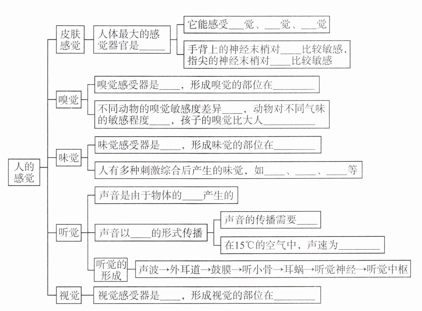 皮肤 触 痛 冷热 冷热觉 触觉 鼻 大脑皮层嗅觉中枢 很大 不同 敏感 舌 大脑皮层味觉中枢 麻 辣 涩 振动 声波 介质 340 米/秒 眼 大脑皮层视觉中枢