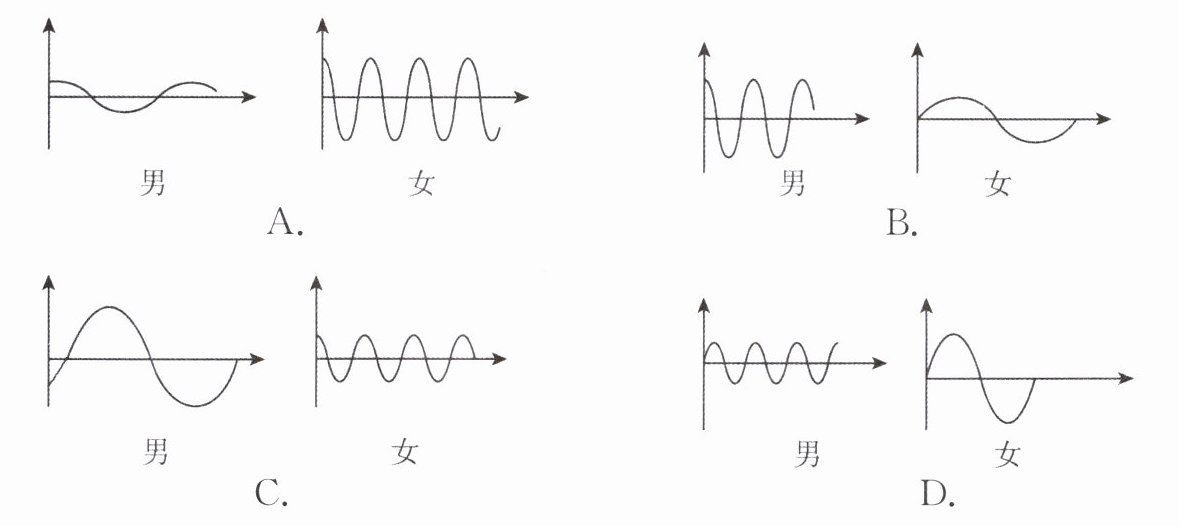 9. 某场音乐会上,一位男低音歌唱家在放声歌唱时,有一位女高音歌唱家在轻声伴唱。下列声音波形图中,能够正确反映上述男、女歌唱家歌唱时的声音特征的是(纵坐标表示振幅,横坐标表示时间)(