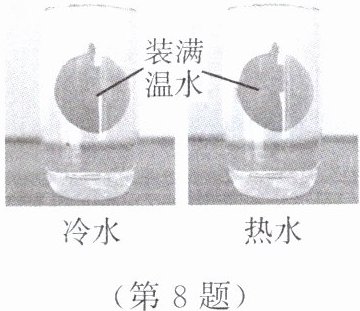 8. 如图所示,在两个薄气球中装满温水,扎紧气球后剪去多余部分,分别浸没于盛有冷水与热水的玻璃杯中。若不计气球皮重与体积,放手后两个气球的运动情况是(