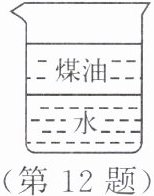 12. 煤油($\rho_{煤油}= 0.8×10^{3}$千克/米^3)和水是两种互不相溶的液体。如图所示,将等体积的煤油和水放入同一个烧杯中,煤油会浮在水的上面。向这个烧杯中投入一小块石蜡($\rho_{石蜡}= 0.9×10^{3}$千克/米^3),则石蜡将(