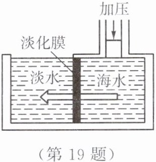 19. 海水淡化可采用膜分离技术。如图所示,对淡化膜右侧的海水加压,水能透过淡化膜进入左侧的淡水池,而溶解在海水中的物质则不能通过淡化膜,从而得到淡水。下列对加压后右侧的海水成分的分析,正确的是(