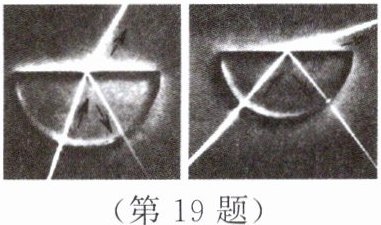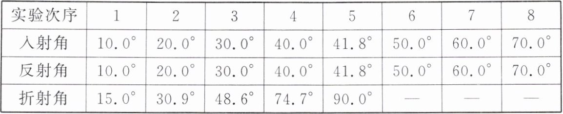19. 研究光的折射现象时,某同学让光沿着半圆形玻璃砖的半径射到直边上,光在直边上发生入射与折射现象,逐渐增大入射角,观察实验现象,得到数据。