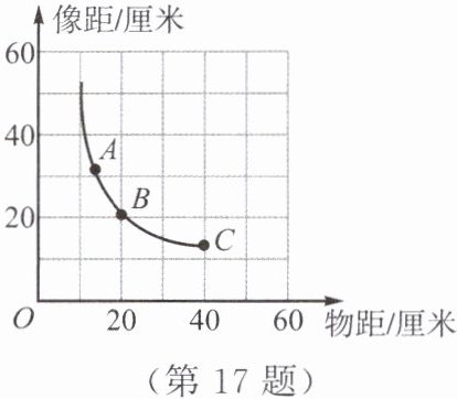 17. 如图所示为某实验小组在做“探究凸透镜成像的规律”的实验时,绘制的物距与像距的关系图像。图中A、B、C三点分别与蜡烛在光具座上移动过程中的三个位置相对应。在A点时,物距