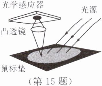 15. 光电鼠标的工作原理是鼠标光源照射鼠标垫表面(如图所示),并经过鼠标垫、凸透镜将光线反射回光学感应器,当鼠标移动时,感应器会连续接收到鼠标垫表面所成的像,并利用数字信号进行处理,以确定移动的距离和方向。鼠标发出的光照射在粗糙的鼠标垫表面时会发生