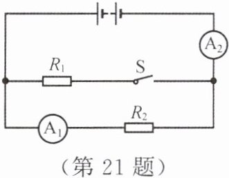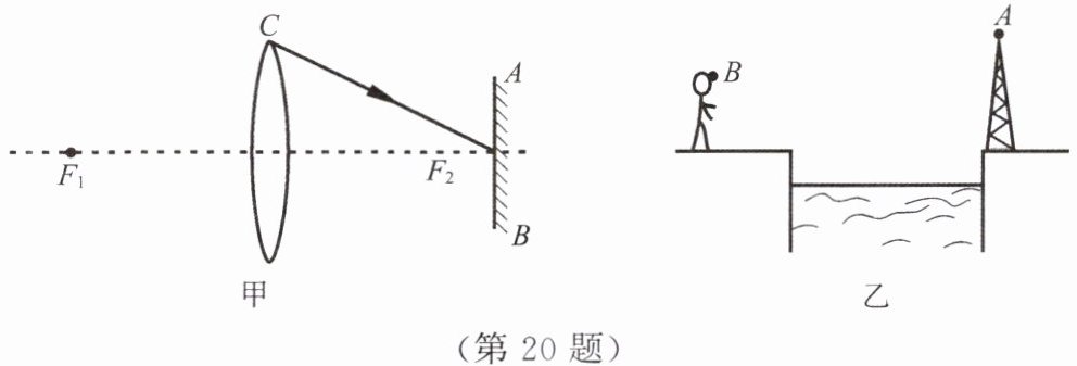 20. (1)如图甲所示$,F_1、$$F_2$为凸透镜的焦点。$CF_2$是经凸透镜折射得到的折射光线,AB为一过凸透镜焦点且与主光轴所在方向垂直的平面镜,请画出$CF_2$进入凸透镜前的入射光线和经平面镜反射得到的反射光线。