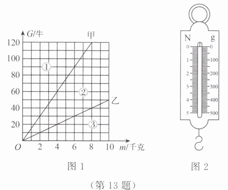 (填“①”“②”或“③”)区域。(3) 如图 2 所示为实验室中的一种弹簧测力计。在地球上,把物体挂在弹簧测力计的挂钩上并保持静止时,从左边的刻度可以读出物体所受重力的大小,从右边的刻度可以读出物体质量的近似值。如果把该弹簧测力计拿到乙星球上使用,应重新标注其刻度值,方法是