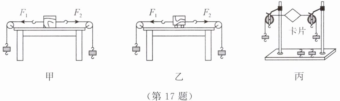 17. 某小组用如图所示的装置探究“二力平衡的条件”,钩码的质量均为 $ 50 $ 克。