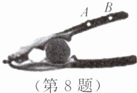 8. 如图所示为一种核桃夹,用大小相同的力垂直作用在B点时比垂直作用在A点时更易夹碎核桃。这说明了力的作用效果(