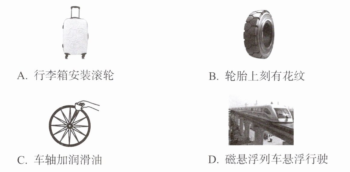 【思路点拨】减小摩擦的方法有减小压力、使接触面更加光滑、将滑动摩擦改为滚动摩擦、加润滑油、形成气垫等。在汽车轮胎上缠铁链显然是为了使接触面更加粗糙,用力握紧绳子和把皮带拉紧都是增大压力,从而增大摩擦。利用气垫可以大大减小摩擦。