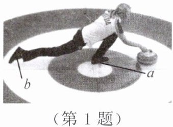 1. 冰壶运动员的运动鞋一只是塑料底的,另一只是橡胶底的,滑行时,橡胶底的鞋受到的摩擦力比塑料底的鞋大。如图所示,运动员用穿$b$鞋的脚蹬冰面后,只用穿$a$鞋的那只脚向右滑行,由此可以确定(