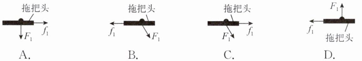 2. 如图所示,拖地时拖把头沿箭头所示的方向匀速运动。下列各图中,拖杆对拖把头的力$F_{1}的方向和地面对拖把头的摩擦力f_{1}$的方向标注正确的是(