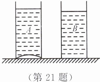 21. 如图所示,水平桌面上有两个不计重力的圆柱形容器$A、B$,横截面积均为$5.0×10^{-3}$米^2,$A$的底面向上凸起,$B$的底面为平面。在两容器中均加入重10牛的水,则$B$对桌面的压强为