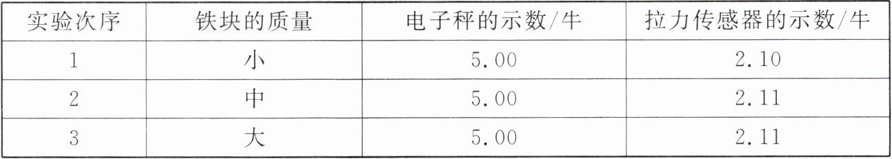 |实验次序|铁块的质量|电子秤的示数/牛|拉力传感器的示数/牛|