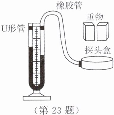 23. 学习小组的同学们开展项目化学习活动,利用废旧材料制作了一个固体压强计,探头盒由无盖塑料盒改造而成,顶部覆盖弹性硅胶膜,侧面打孔后与橡胶管相连,橡胶管的另一头与U形管相连。