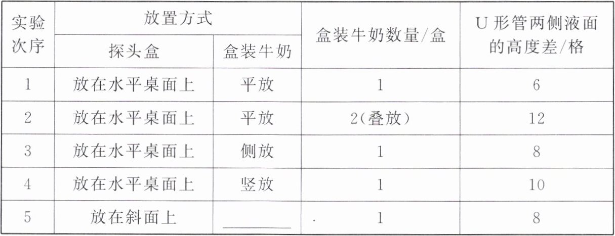 (2)利用该自制固体压强计、斜面和重物等进行实验:将探头盒放置在水平桌面或斜面上,以长方体形状的盒装牛奶作为重物,改变放在硅胶膜上的盒装牛奶数量及放置方式,记录U形管两侧液面的高度差。实验数据如下表所示。