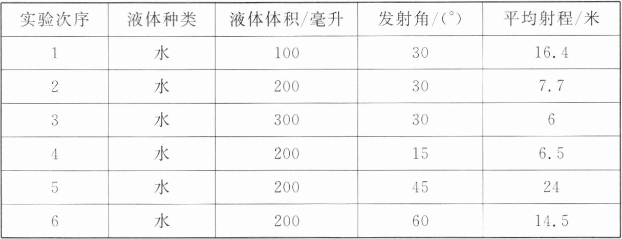 |实验次序|液体种类|液体体积/毫升|发射角/(°)|平均射程/米|