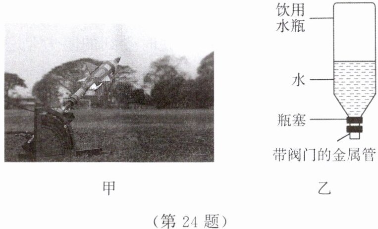 24. 某同学在老师的指导下开展了“制作水火箭”的项目化学习活动。如图甲所示,往550毫升的空饮用水瓶中加入适量的水,塞好瓶塞后放在发射底座上,用打气筒向瓶内打气,当瓶内的气体压强达到一定大小时,高压气体会将水和瓶塞从瓶口压出,水火箭飞向高空。发射成功后,测量水火箭在水平方向上的射程。
