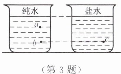 3. 关于如图所示的液体中 $ a $、$ b $、$ c $ 三点的压强,下列说法中正确的是(盐水的密度为 $ 1.03×10^{3} $ 千克/米 $ ^{3} $)(