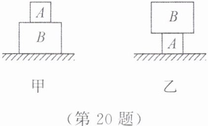 20. 已知实心圆柱体 $ A $、$ B $ 的底面积之比为 $ 1:3 $,高度之比为 $ 2:3 $,构成 $ A $、$ B $ 两个圆柱体的物质密度分别为 $ \rho_{A} $ 和 $ \rho_{B} $。若将物体 $ B $ 放在水平地面上,将物体 $ A $ 叠放在物体 $ B $ 上面(如图甲所示),则此时物体 $ B $ 对地面的压强为 $ p_{1} $;若将物体 $ A $ 放在水平地面上,将物体 $ B $ 叠放在物体 $ A $ 上面(如图乙所示),则此时物体 $ B $ 对物体 $ A $ 的压强为 $ p_{2} $,若 $ p_{1}:p_{2}= 1:2 $,$ g $ 取 10 牛/千克,则 $ \rho_{A}:\rho_{B}= $