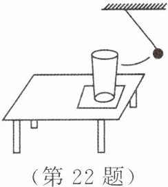 22. 小明想比较几种常见装修材料的吸音性能,他找来厚度相同的四种小块材料(聚酯棉、软木、泡沫和海绵),进行了图示实验:桌面上放一个玻璃杯,在玻璃杯下分别放上待测试的小块材料,将悬挂在细线下的小球拉到某一高度释放去敲击玻璃杯,仔细比较玻璃杯发出的声音大小。