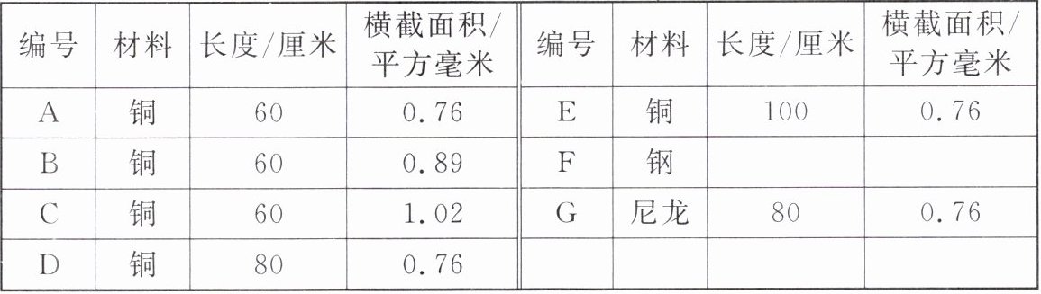 |编号|材料|长度/厘米|横截面积/平方毫米|编号|材料|长度/厘米|横截面积/平方毫米|