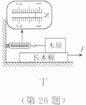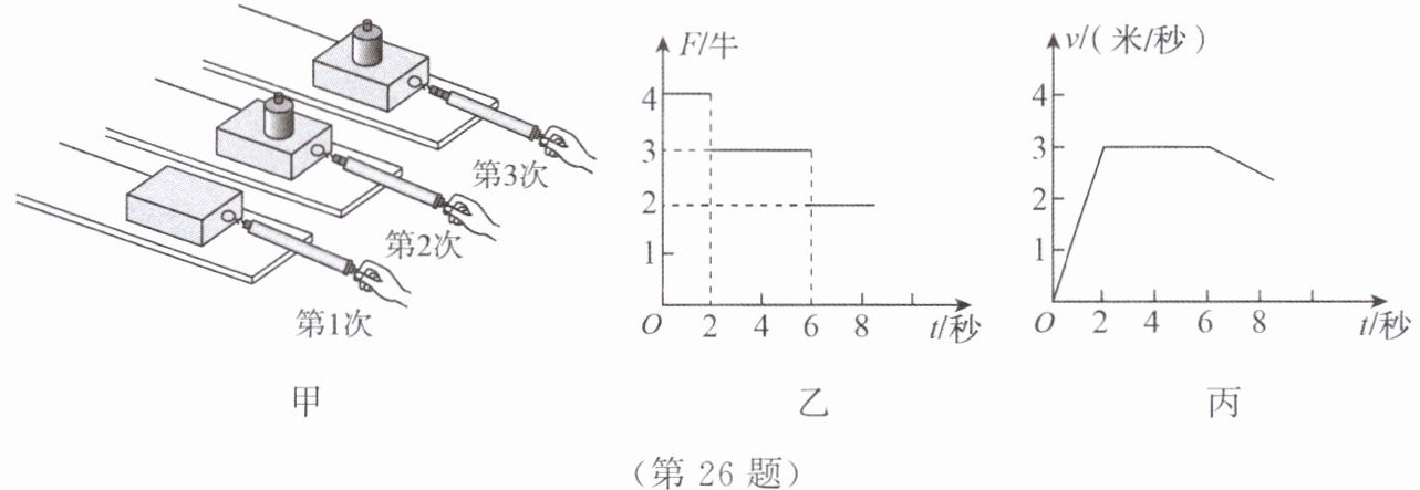 26. 在“探究影响滑动摩擦力大小因素”的实验中,小英做了如图甲所示的三次实验,用到了一个弹簧测力计、一个木块、一个砝码、两块材料相同但表面粗糙程度不同的长木板。其中第1次和第2次实验用同一块长木板,第3次实验用表面相对粗糙的长木板。
