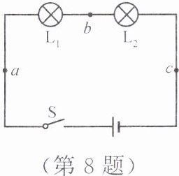 8. 在“探究串联电路中的电流特点”的实验中,某同学用电流表分别测出图中 $ a $、$ b $、$ c $ 三处的电流大小,并初步得到串联电路的电流特点。为了进一步验证这一结论,下一步应采取的操作是(