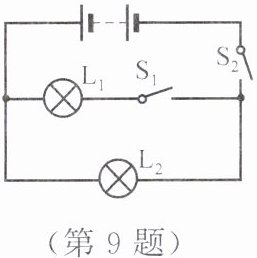 9. 在如图所示的电路图中,各元件都完好,闭合开关 $ S_1 $、$ S_2 $,只有灯 $ L_2 $ 发光,故障可能是(
