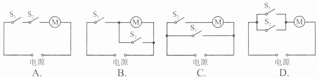 5. 指纹锁是目前使用比较广泛的锁具,通过“指纹”开关 $ S_1 $ 或者“密码”开关 $ S_2 $ 都能启动电动机使其运转,从而打开门锁。下列控制电路中,符合要求的是(