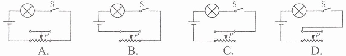 6. 下列电路图表示了滑动变阻器的四种不同接法,闭合开关后,当滑片向右移动时,电路中灯泡变亮的是(