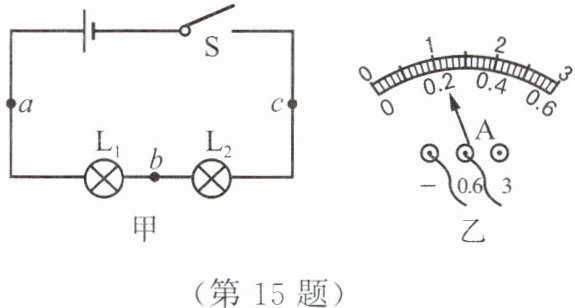 15. 在“探究串联电路的电流特点”的实验中,小虹同学选用两个不同的小灯泡组成了如图甲所示的串联电路,然后把一个电流表分别接在 $ a $、$ b $、$ c $ 三处去测量电流。
