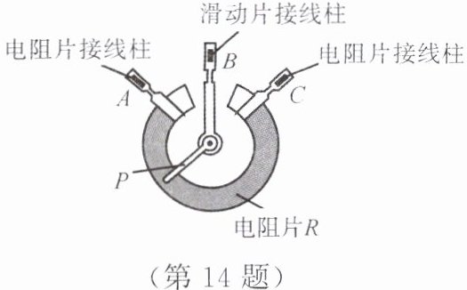 14. 如图所示为旋转式变阻器的结构图,$ A $、$ B $、$ C $ 为变阻器的三个接线柱,$ P $ 为旋钮触片。将该变阻器接入电路中来调节灯泡的亮度,当顺时针旋转旋钮触片时,灯泡变亮,则应连接接线柱