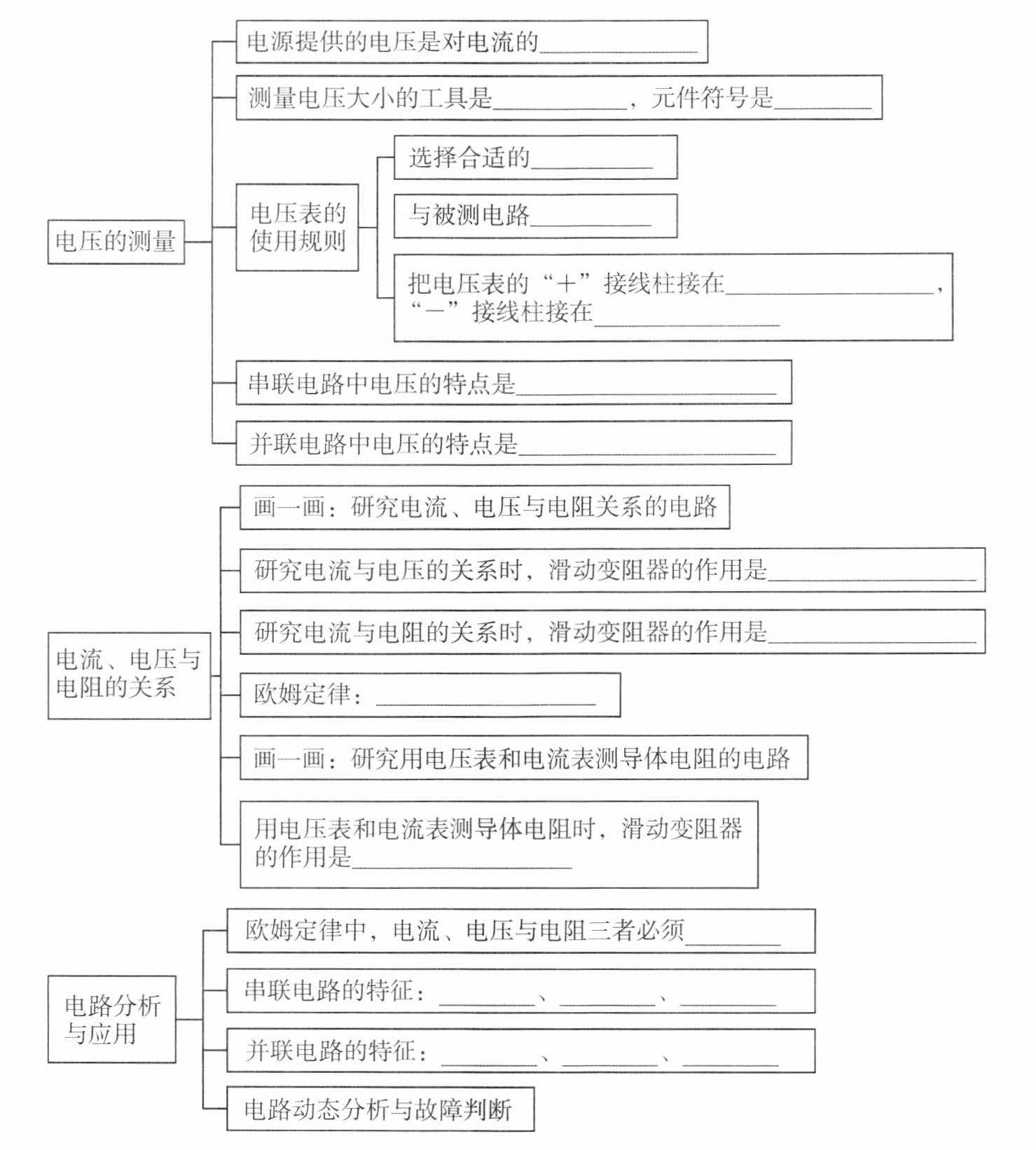 推动作用 电压表 Ⓥ 量程 并联 与电源正极相连的那端 与电源负极相连的那端 串联电路电源总电压等于各部分电路的电压之和 并联电路各支路两端电压相等 如图甲所示 调节变量,即调节电阻(被研究的电路)两端的电压,并保护电路 控制变量,即使电阻(被研究的电路)两端的电压保持不变,并保护电路 导体中的电流,跟这段导体两端的电压成正比,跟这段导体的电阻成反比 如图乙所示 实现多次测量取平均值,以减小误差,并保护电路 有对应性 串联电路电流强度处处相等 串联分压 总电阻等于各部分电阻之和 并联电路干路电流等于各支路电流之和 各支路两端电压相等 总电阻的倒数等于各支路电阻倒数之和(总电阻小于任何一个支路电阻)