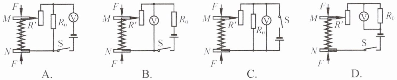 【变式】某种握力计的原理如下:弹簧上端和滑动变阻器的滑片固定在一起,$R_{0}$为保护电阻,握力大小可通过电压表的示数来显示。手握紧MN时,握力越大,电压表的示数越大。下列电路图中,属于该握力计原理图的是(