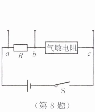 8. 如图所示为某简易煤气检测电路,其中气敏电阻的阻值随煤气浓度的升高而减小。若输出信号的仪表选用电压表或电流表,闭合开关 $ S $,当煤气浓度升高时,要求仪表的示数增大,则应(